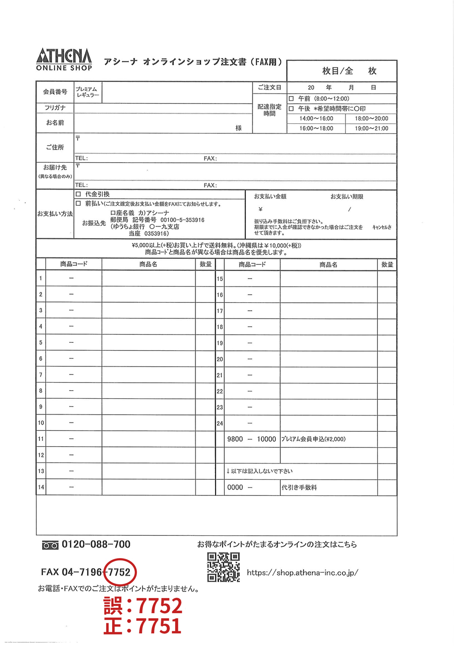 FAX注文書の下部に記載したFAX番号に誤りがございました。