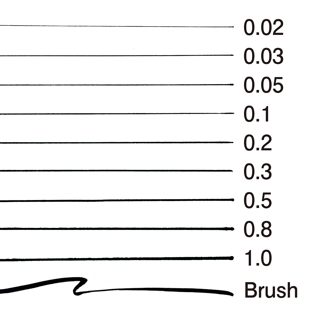 耐水性の水性顔料インクを採用し、超極細0.03mm/0.1/0.3/0.5/0.8mmをセットにしたミリペンのセット。 硬めの描き味でしなりにくいので、筆圧の強い方も快適に使えます。イラストなどのペン画やペン入れに。