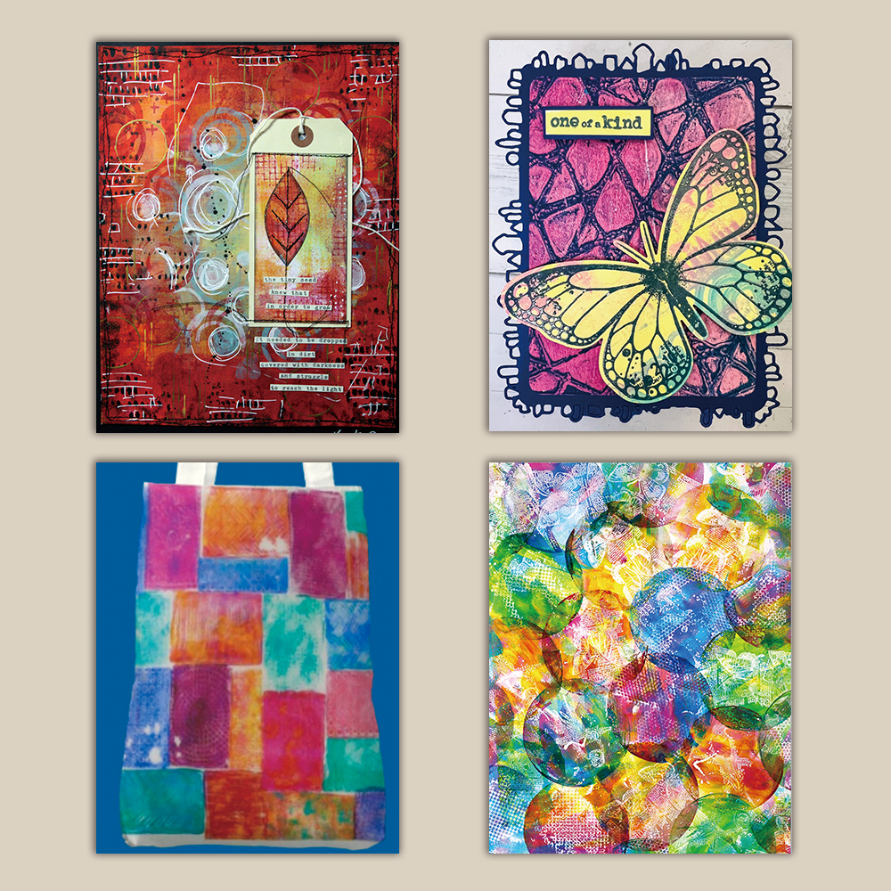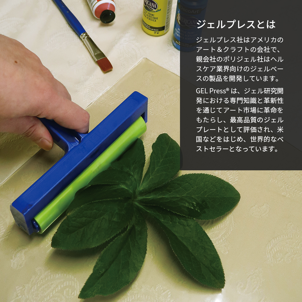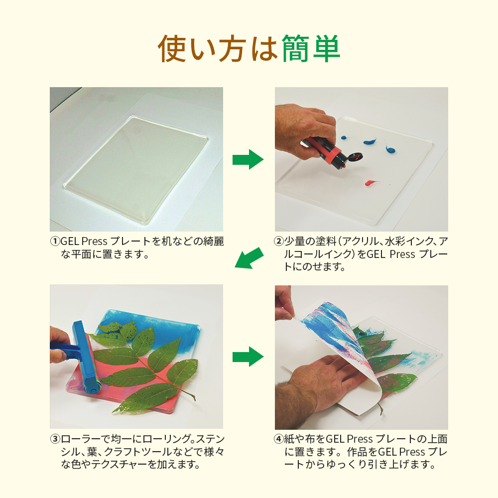 表面は、より細部と質感を捉えるように設計され、ローラーを使うと上手く仕上がるように作られています。 GEL Press プレートは、アクリル絵具、水彩絵具、水性インク、アルコールインク等で使えます。